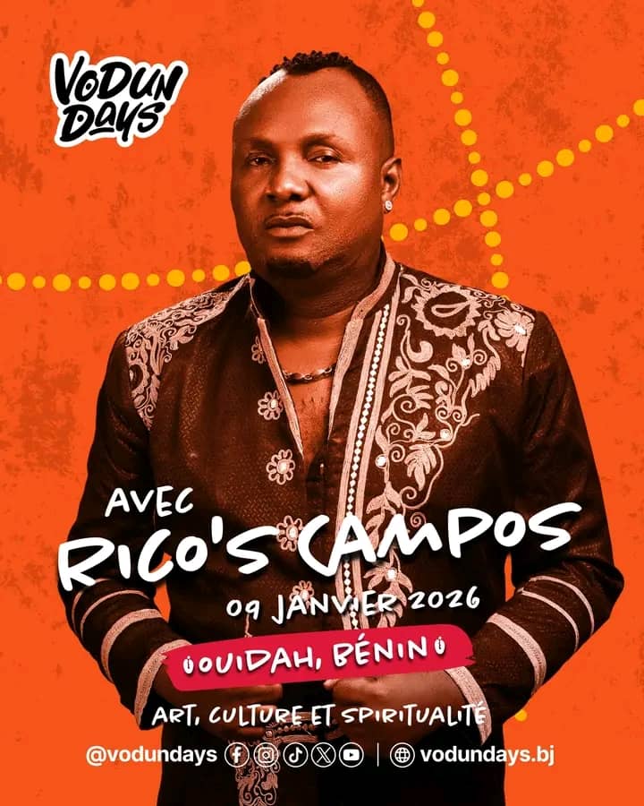 À l’instar de l’édition 2025, le Adjapiano sera à nouveau à l’honneur. Cette nouvelle identité musicale béninoise portée par Ghix & X-Time fera vibrer la scène des Vodun Days le jeudi 8 janvier 2026 à Ouidah. En attendant de connaître les autres artistes qui feront le show, un nom emblématique s’impose déjà : Rico’s Campos. Il est le premier artiste annoncé pour la soirée du 9 janvier et le deuxième pour les festivités de façon générale.